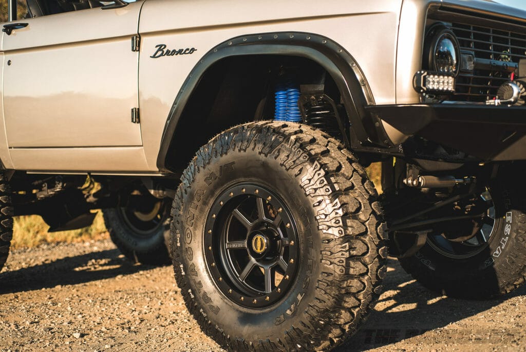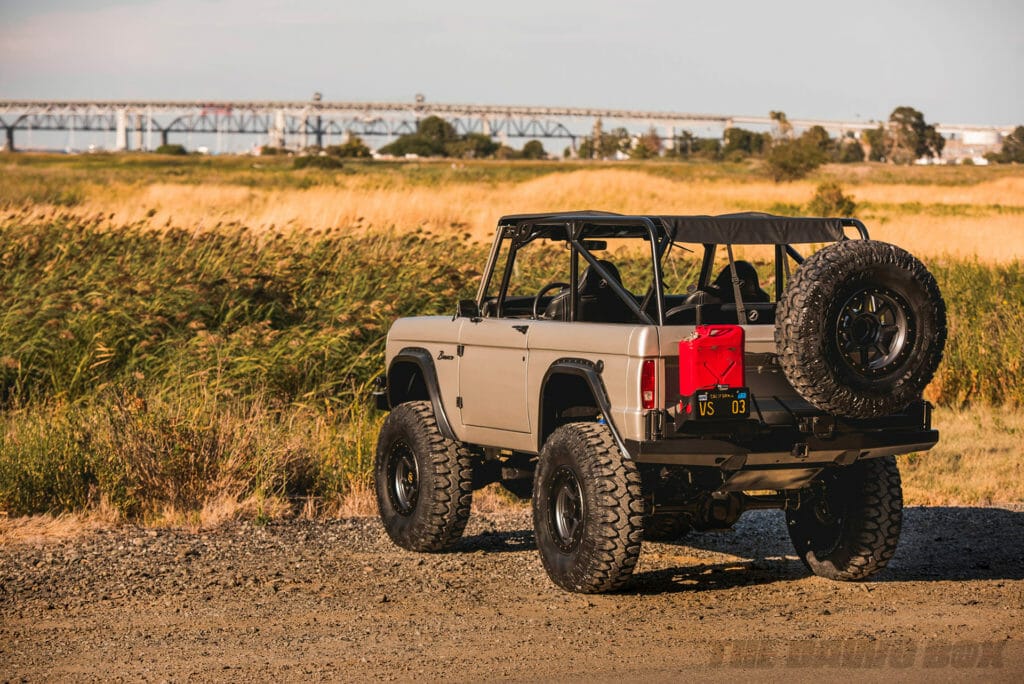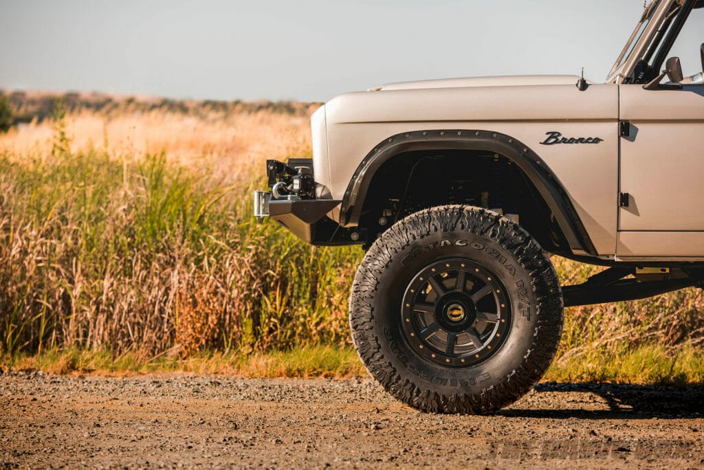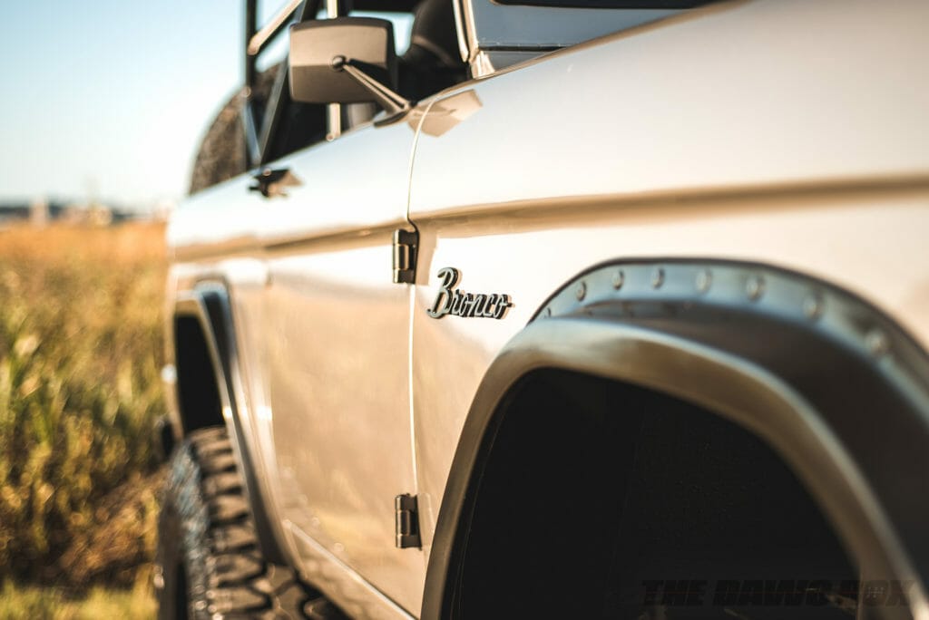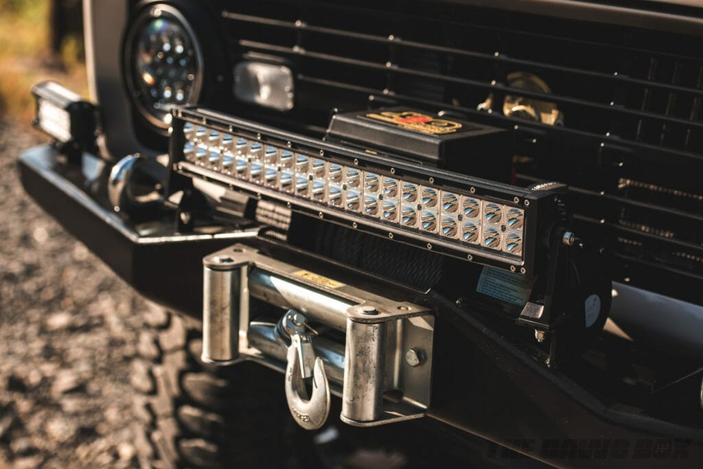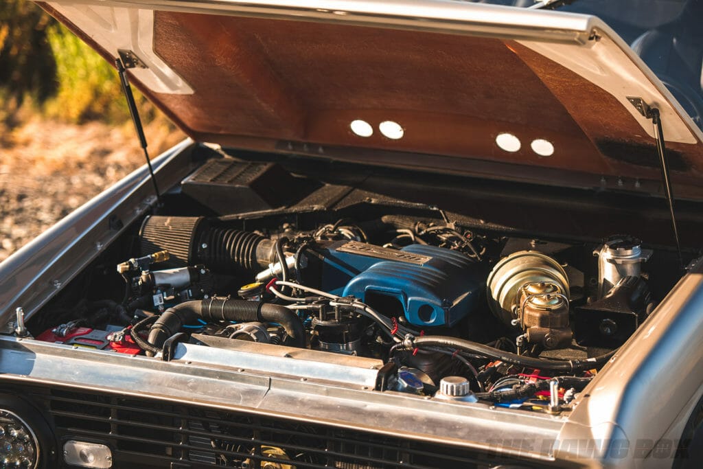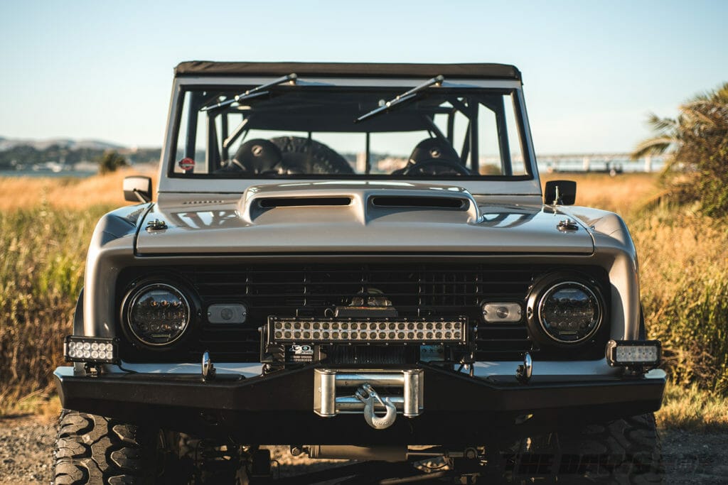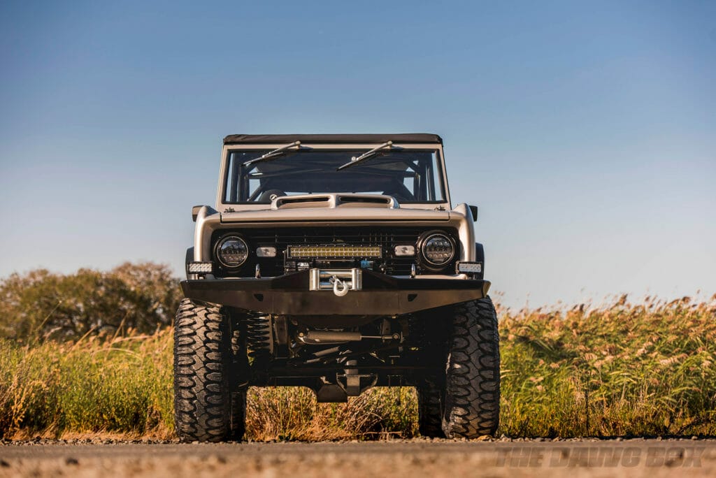 Inside and out, Bryan’s Bronco is chockfull of class and style, blending old-school and proven technology with some modern upticks to really make it shine. The body was fitted with fiberglass front fenders, a forced-air hood was installed with gas shocks, then the whole thing was painted in PPG’s Silver Birch paint with a clear coat. A ProtoFab front bumper houses a Smittybilt X20 winch with a complementary ProtoFab rear bumper and a tire swing hanging out back.