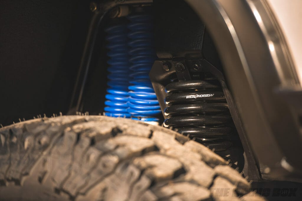 The whole rig sits on a Wild Horses 5.5-inch suspension lift, front and rear and uses dual shock hoops with dual shocks at all four corners. A 2-inch body lift gives the extra bit of clearance needed to not chop the body up for those big Milestar meats.