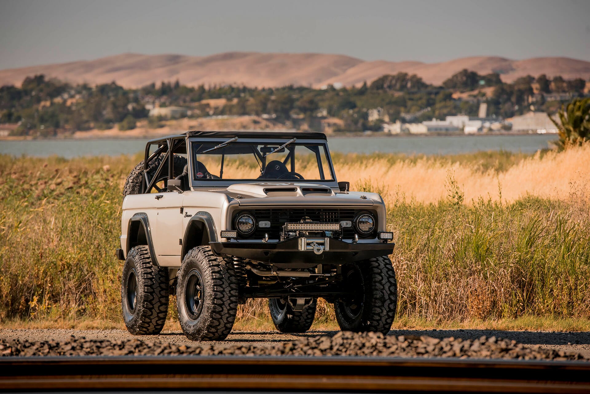 Inside and out, Bryan’s Bronco is chockfull of class and style, blending old-school and proven technology with some modern upticks to really make it shine. The body was fitted with fiberglass front fenders, a forced-air hood was installed with gas shocks, then the whole thing was painted in PPG’s Silver Birch paint with a clear coat. A ProtoFab front bumper houses a Smittybilt X20 winch with a complementary ProtoFab rear bumper and a tire swing hanging out back.