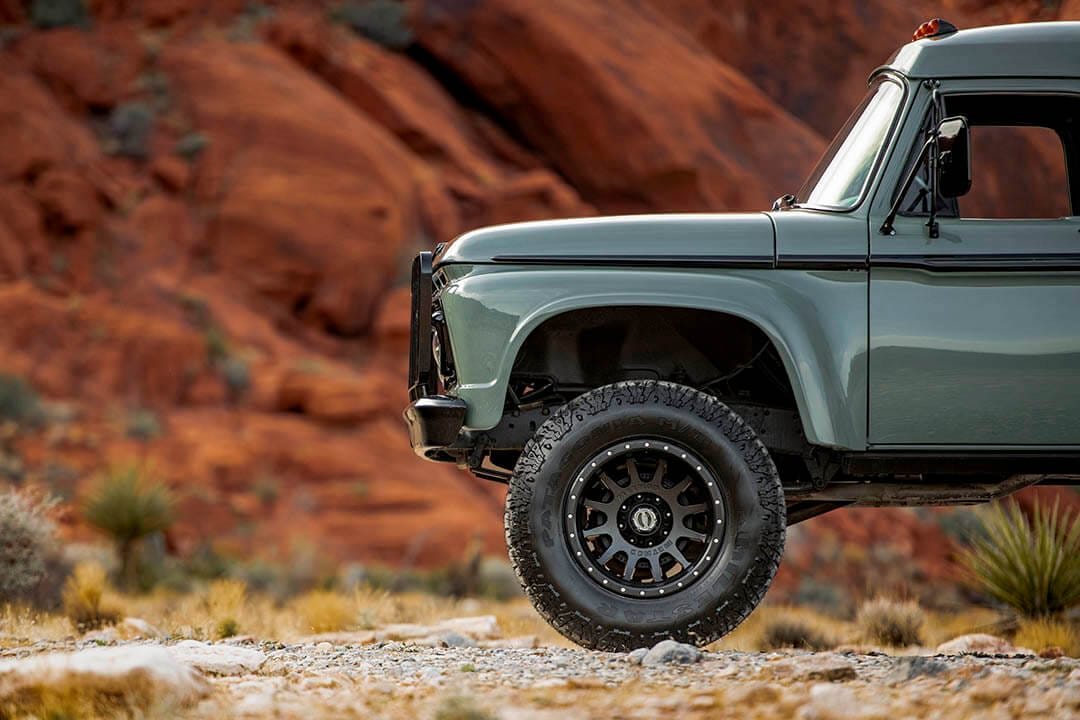 To increase the big look of the truck shell itself and give it that Hodson Motors classic touch, the suspension was lifted a full four inches all around. The original frame and axles were utilized in the overhaul, and the roll cage you see—it’s made from 4-inch pipe, not hollow tube, so it’s super heavy and damn near bulletproof. To capitalize on the taller ride height, a set of 20-inch Method NV wheels were selected, as was a set of 38-inch Patagonia M/T de Milestar tires to ensure the truck was as capable to handle rough terrain and not just look the part.