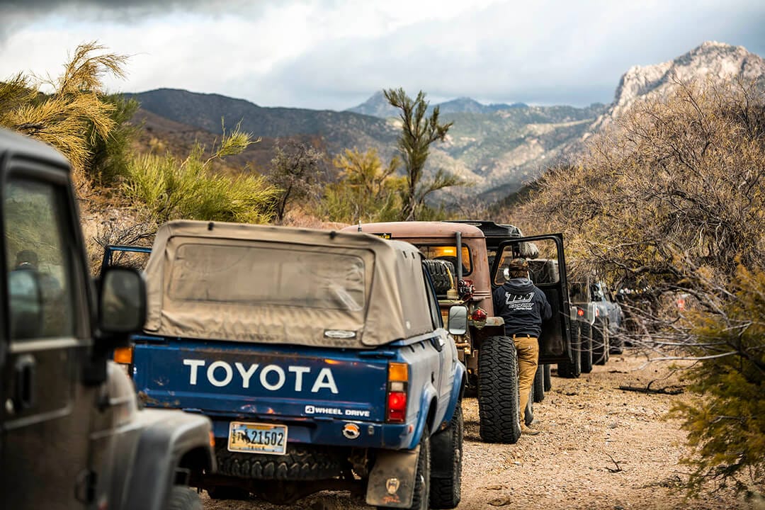 A dirt road hugged the side of the mountain, with an imaginary guard rail protecting you from a steep cliff. It was pure beauty, dirt stained rigs lined up along the Hualapai mountain pass, views as far as the eyes could see. Every second was a photo opportunity, people hopping out to take pictures of other peoples rigs, admiring the sights, talking about how great this trip was. And then out of nowhere, it was almost as if a strong force was trying to get us off the mountain, strong winds blowing from every direction. Not just any ordinary winds either, these were extraordinarily cold, so you know once everyone was back inside their rigs, there was no getting out until camp.