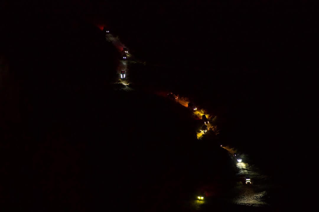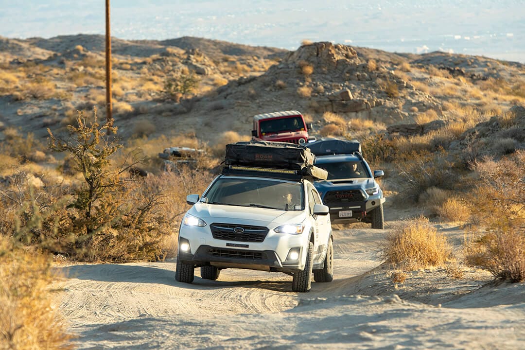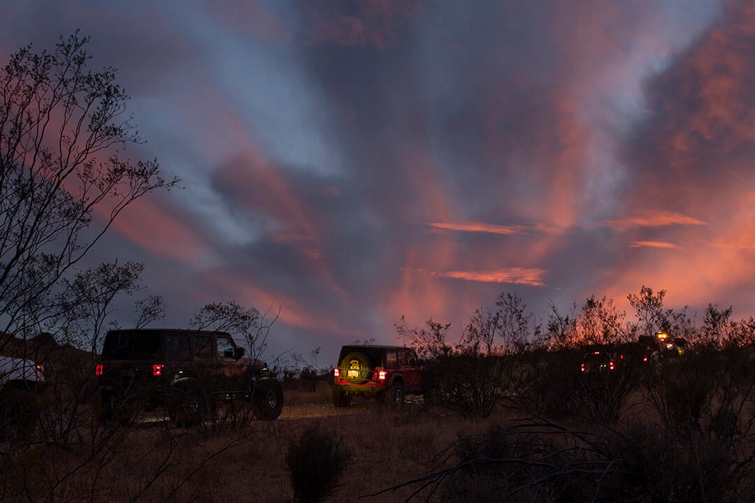 Remember how it was emphasized that you should come prepared for any situation? Well this was extremely important in the case of a Subaru Crosstrek that gave its all to keep up with the pack. An incredible hill climb that challenged even the most rugged rigs on the excursion proved a little too difficult for the Subaru, and along the way up, a large boulder had a bit of fun with a lower control arm. This is something expected from a grueling trail, though, and a few guys got together to get the Subaru back up and running. However, this was in no way a setback. As excited as some of the participants were to get their hands dirty working on a car, the rest of the group got to sit and enjoy an extraordinary sunset. Once this was resolved, the leader radioed the tail gunner to make sure the group was back together, and we set forth through the night, weaving our way through an incredible, yet tight, wash to get to the campsite.