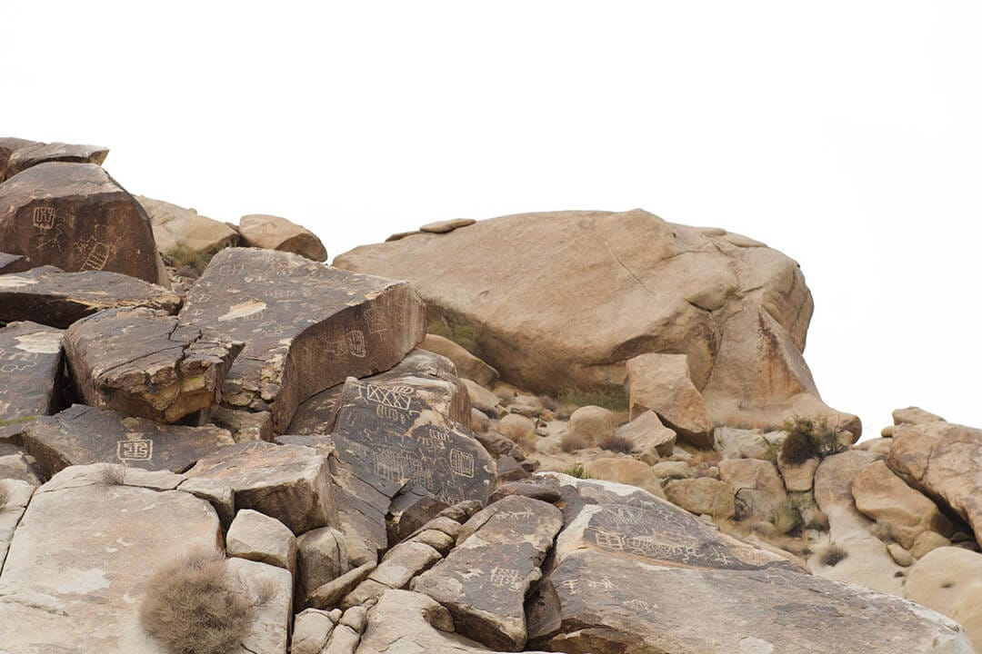 Once each rig was at its desirable psi, we loaded up and set out on the adventure. The first trail was fairly mild, mostly a dirt road with everyone sticking relatively close together to get a feel for what the days ahead could consist of. Along the way, we noticed small trees on the side of the road decorated with Christmas ornaments. Not too long after, an entire area was littered with these trees, so it was only right to get out and shoot a group photo. After a short break and stretch, it was on to the first official stop, the Grapevine Canyon Petroglyphs in Searchlight, AZ.