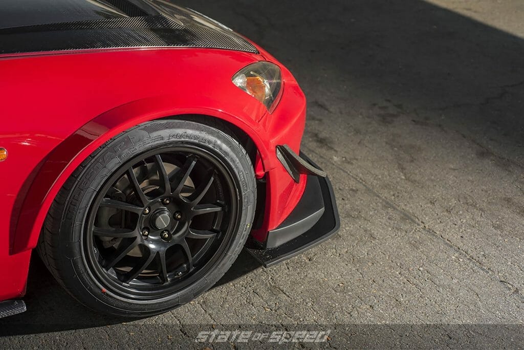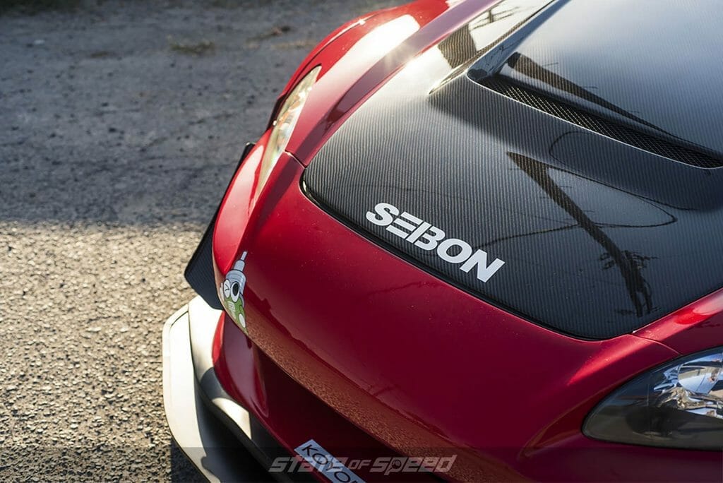 The body is also just modified to fit the wider wheels and Milestar Tires under the body with a set of Voltex Fender Flares. A custom Sportcar Motion front splitter is made to fit the ASM I.S. Design Aero front bumper. This bumper and splitter combination is designed to allow enough air to flow around the body but also keep it flowing to the Koyo Racing Radiator to keep the engine cool. The Voltex Wing, J’s Racing Rear Diffuser, Password JDM Canards, and Downforce Side Skirt Diffuser all improve the flow of the air around the body, but the Seibon Carbon Hood and Hardtop help reduce its weight.