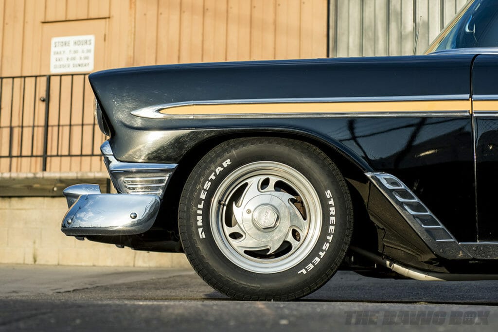 The best part though is the underpinnings beneath all that sheetmetal and trim. Rather than the stock 265ci V8, Eric’s Nomad boasts a GM crate 350 small block backed by a 700R4 automatic transmission. Like any good hot rod, it sends the power back to a Ford 9-inch rear which redirects it to spin a set of aggressively designed billet wheels wrapped in Milestar StreetSteel rubber. “I’ve driven this car to a couple of shows and swap meets,” says Eric. “It drives like a new car because of the late model running gear but with the original look.”
