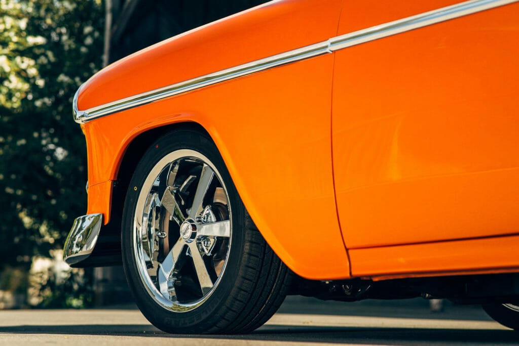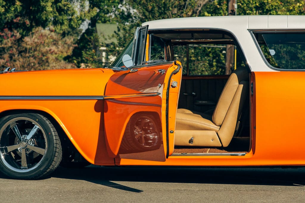 Fortunately for Hill’s Rod and Custom in Pleasant Hill, CA, this 1955 model wasn’t crushed or destroyed but was still put through a full, frame-off restoration before it was modified. Brian Hill pulled every piece and part off to strip, bang, straighten and finally repaint his in the Lamborghini Orange Pearl. However, it’s not a proper looking Nomad if the top isn’t its signature pristine white for that classic two-tone look.
