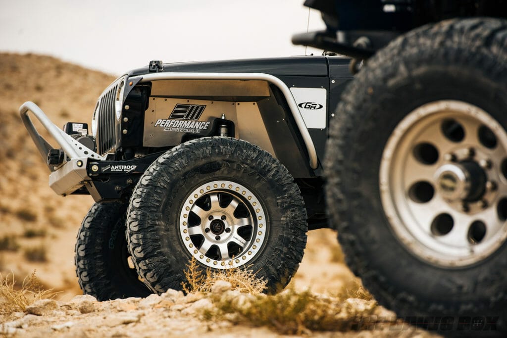 The Jeep was built by Engelhart and Moat (EM) Performance in Santa Fe Springs, CA, of which Jamie Moat talked to us about the build. “We wanted to build a fully capable Jeep with the best bolt-on part in the industry,” he said when we asked him about the build. The full build time was only four months, but the quality you see in not just the parts, but the finished product looks like a TJ that was built over several years. The mirror finish black paint job was done by One Off Rides Garage in Corona, CA and just doesn’t look like a paint job a crawler would have. That probably speaks more about the driving style of Zamora, though.