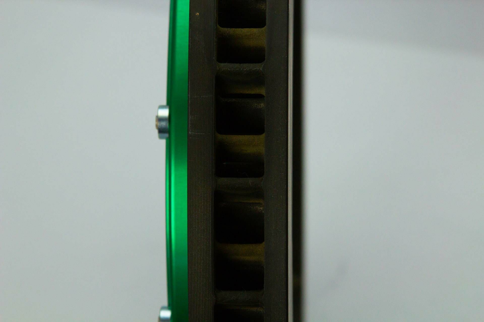 A solid face rotor will be the most rigid and can dissipate heat very well. It can take a little more abuse and can also be resurfaced easily from “warping”. It’s the simplest design that all OEs take advantage of because it doesn’t require extra machining or complex work to build or mold it. While it’s simple, it’s still very effective in most high-performance brake systems where pad gassing and debris clearing isn’t an issue.