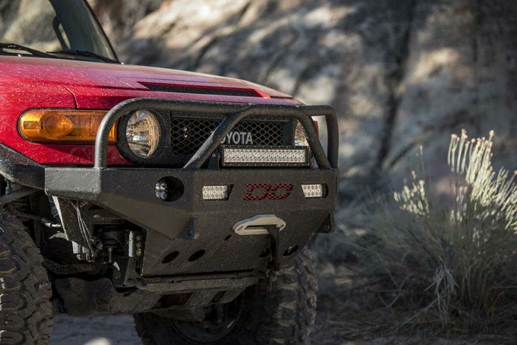 Next, the focus was placed on the exterior of the body. Demello Offroad specializes in quality components for Toyotas. They decked the rig out with front and rear bumpers, side bars, and a roof rack LED light bar mount. They then added a Smittybilt 9.5k XRC winch and a host of Baja Designs LED lights.
