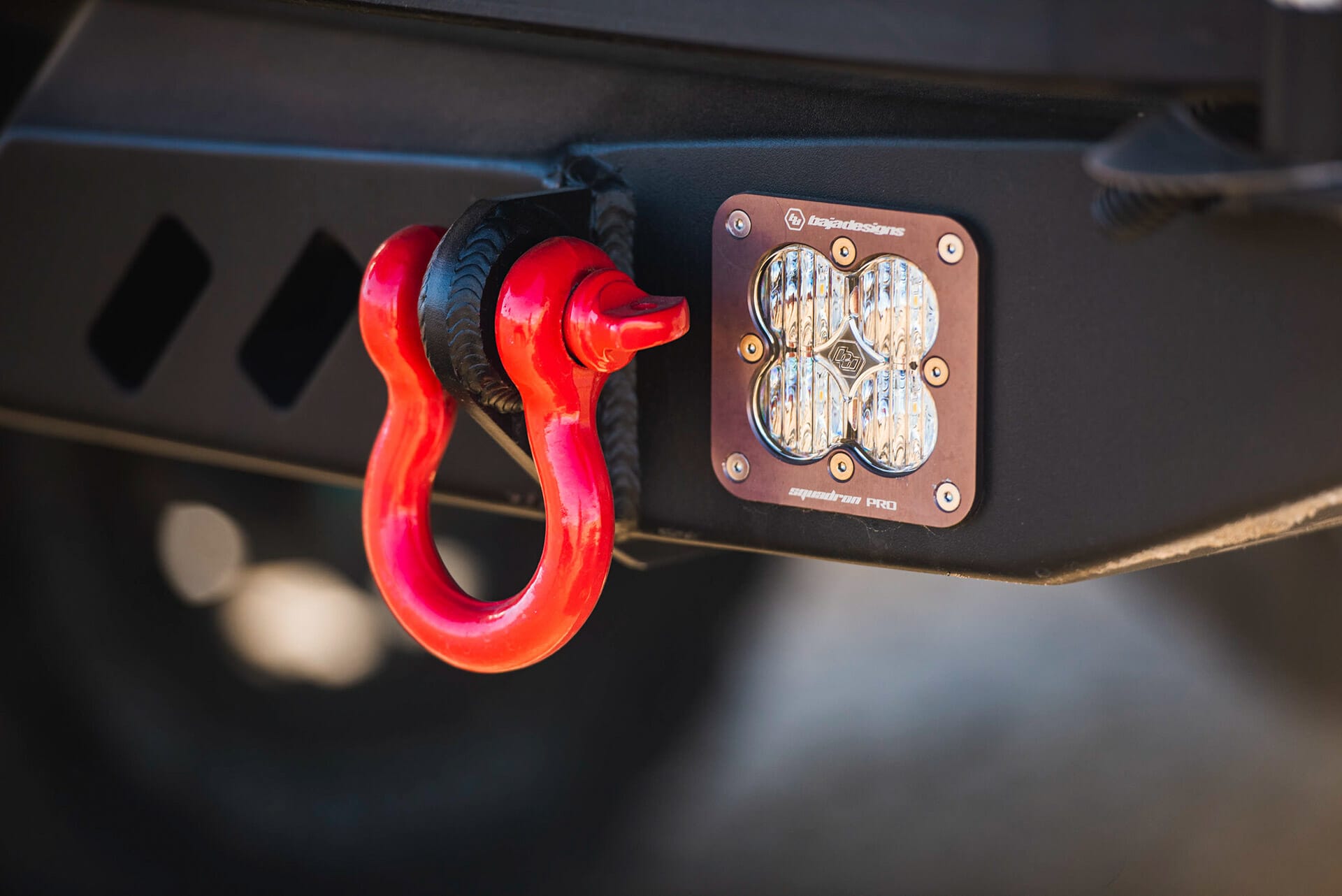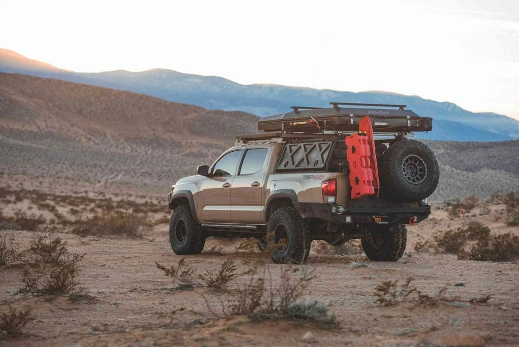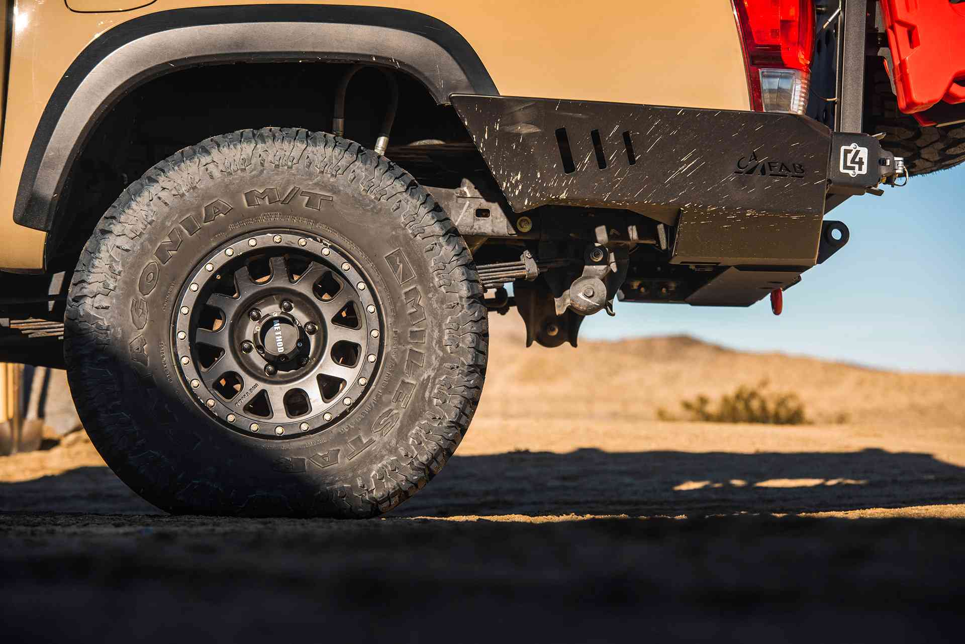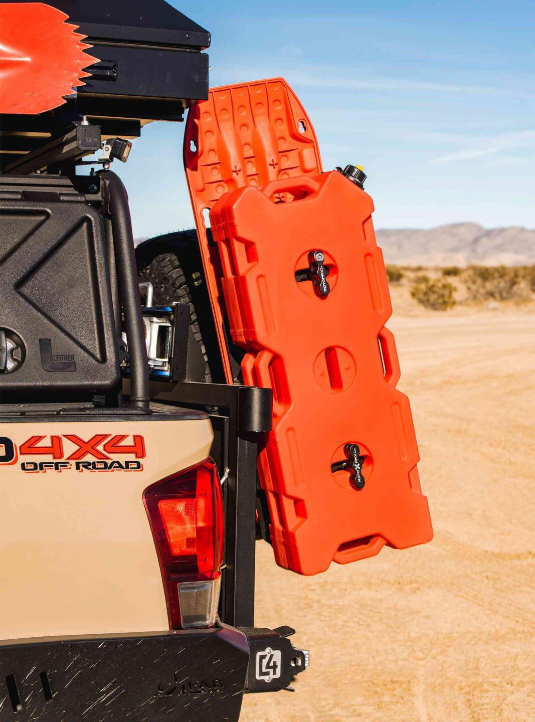 Outback is a C4 Fab high clearance rear bumper with swingout. In addition to the recovery points and LED lighting like the front, it also carries a full sized spare, 2 Rotopax fuel containers and sand ladders.