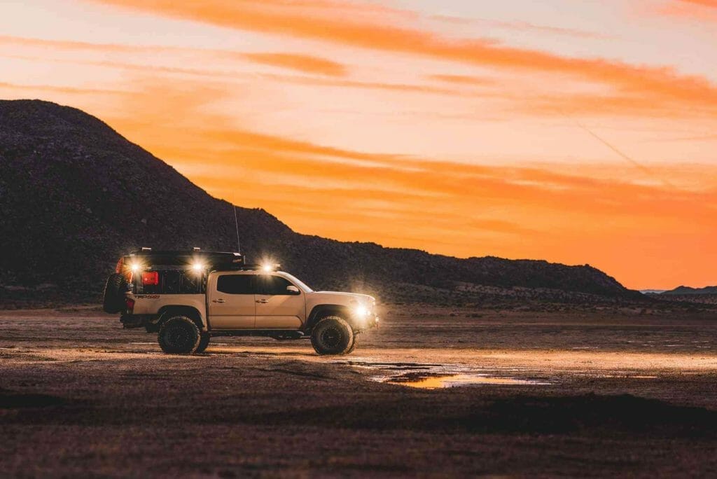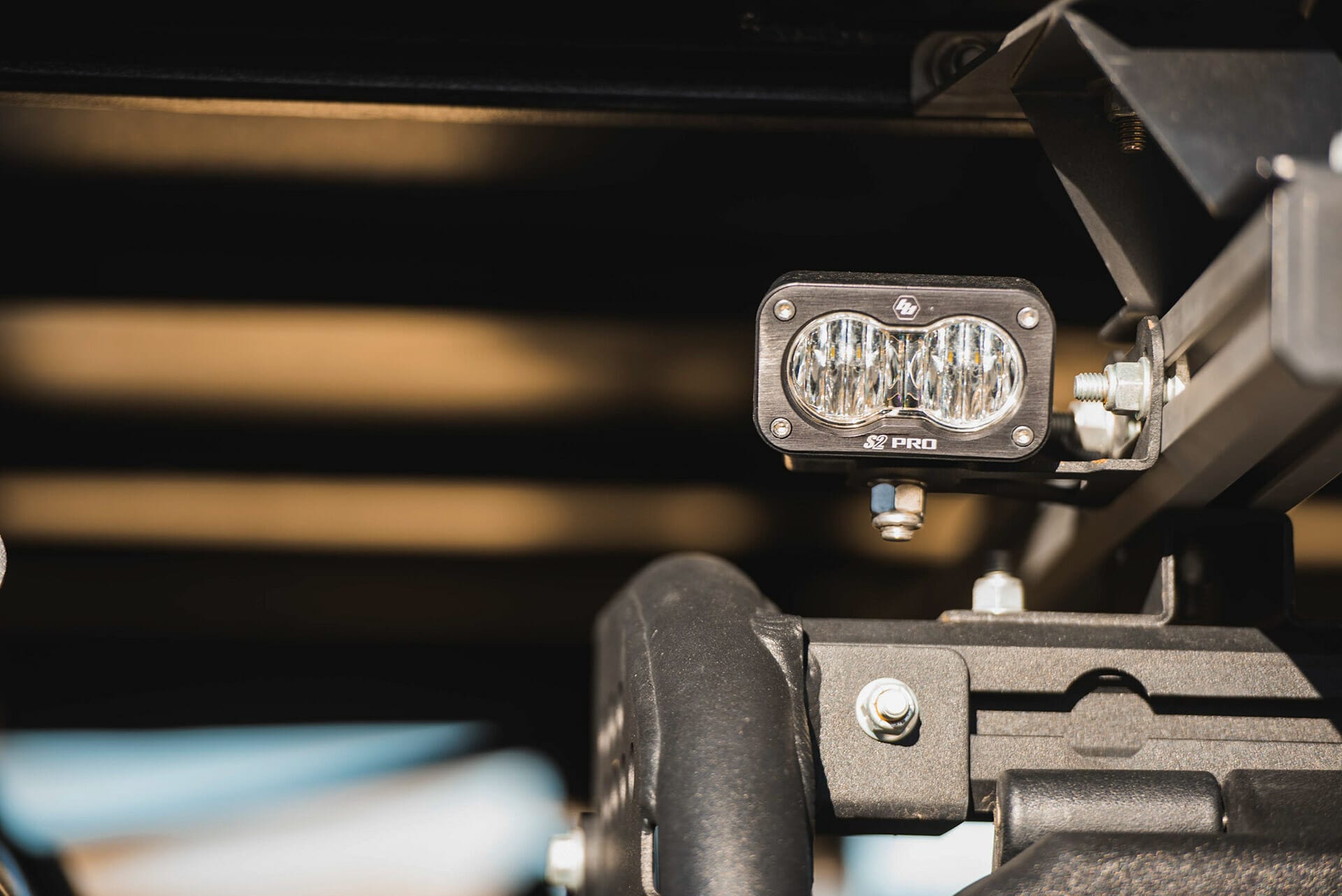 The Tacoma’s bumper is loaded with essentials like recovery rings, and a Warn Zeon 12s platinum winch. It also mounts a full complement of Baja Designs LED lights. A light bar, fog lights, and ditch lights at each corner give Noah specific lighting for all conditions. His custom lighting covers the entire truck with supplemented rack, rock, reverse, and recovery lights. Along both sides of the Tacoma are C4 Fab rock sliders, and Pelfreybilt skid plates protect underneath.