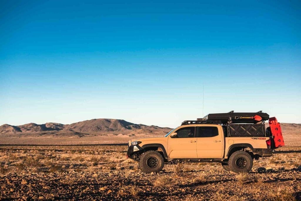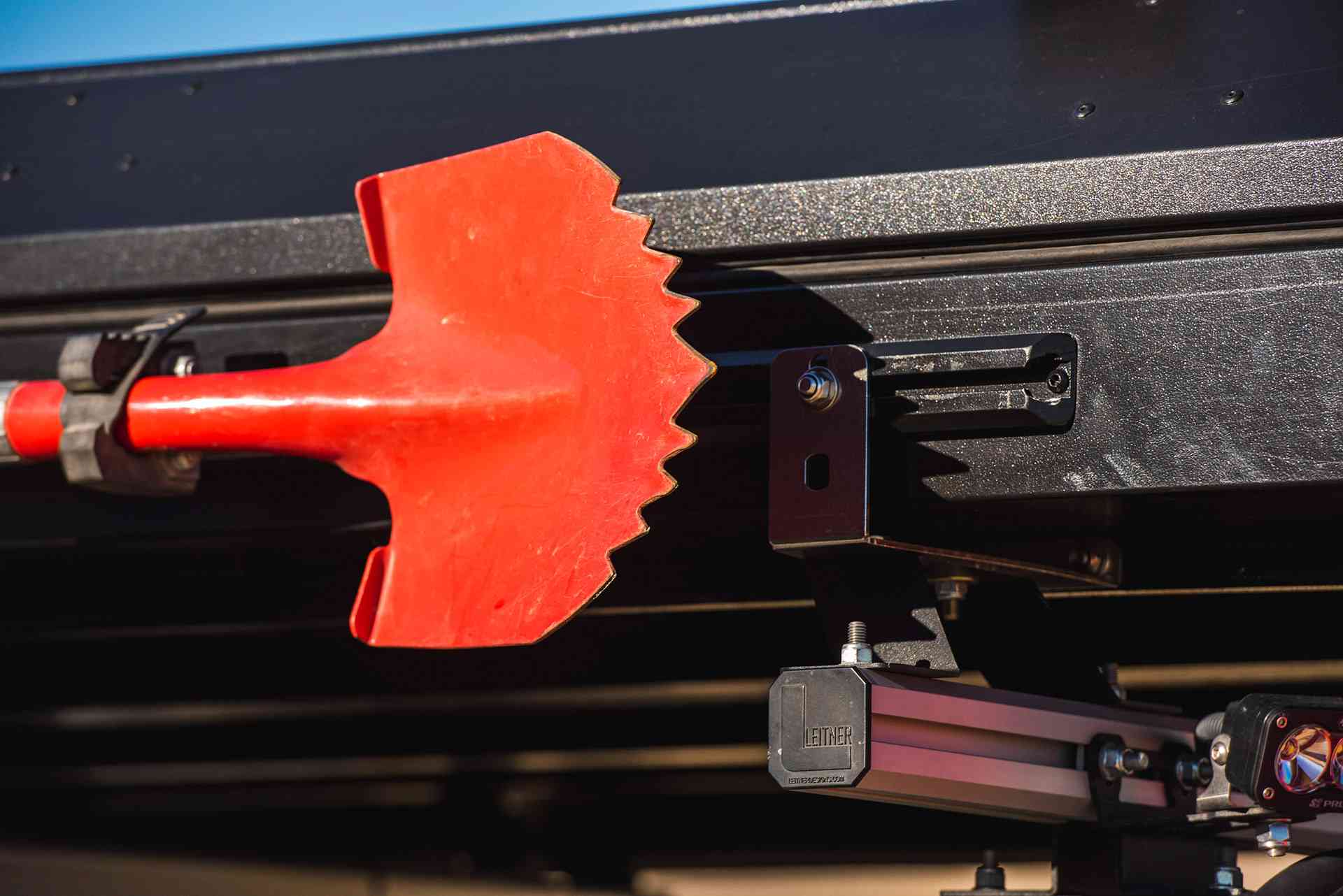 A Solo Motorsports jack mount keeps the jack secured, and Leitner Designs bed rack and storage pods stow additional gear. A Front Runner Outfitters roof rack offers even more utility and creature comforts are provided by an Alucab rooftop tent and side awning.